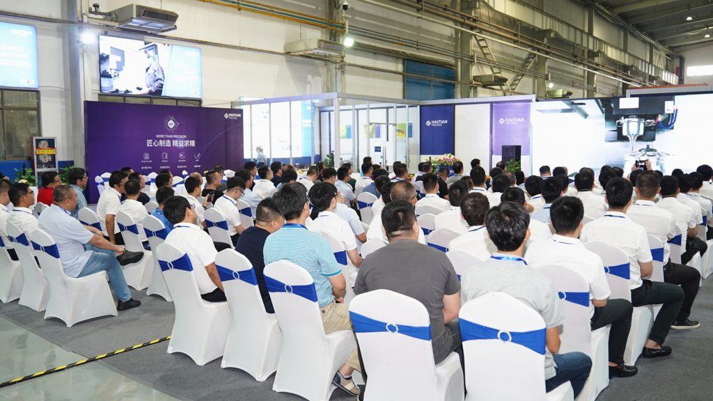 新產品發布會在全新制作的新機介紹視頻中拉開帷幕,海天精工副總經理林洪然先生進行了創新技術分享,對產品的結構升級、布局優化、產品性能提升、配置選項增加進行了解析。8臺全新二代機集中亮相精工堰山車間,包括數控車床HTCⅡ系列、立式加工中心VMCⅡ系列、立式龍門加工中心GUⅡ系列,展示了其穩固的床身結構,卓越的加工性能,宜人性操作界面。各代理商駐足觀看,對全新系列產品贊賞不已。