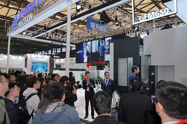 此次展會,海天精工帶來六款高性能、高精度、高效率的機(jī)床產(chǎn)品,這些機(jī)型在結(jié)構(gòu)設(shè)計、控制系統(tǒng)、加工精度等方面均實現(xiàn)了突破。參觀者們紛紛駐足觀看,對海天精工的產(chǎn)品贊不絕口。特別是全新研發(fā)的GFM650龍門五軸高速銑削中心與兼?zhèn)渑P式和立式加工能力的HF80H 臥式五軸加工中心更成為全場焦點(diǎn),參觀咨詢者絡(luò)繹不絕。