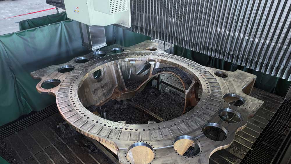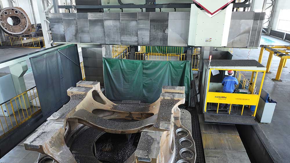 甘肅日月主要生產配套陸上風機,包括風機的輪轂和底座,這就要求機床具備高剛性、強力切削、加工范圍廣的特性。廠區內8臺海天精工大型重型龍門加工中心擁有超寬方滑枕、6米門寬,像穩固的磐石使加工過程運行穩定。甘肅日月生產副廠長蔡安強對此表達了贊賞:“海天精工龍門的滑枕寬度比一般的都大,達到了500×500,完全滿足切削的剛性要求。”