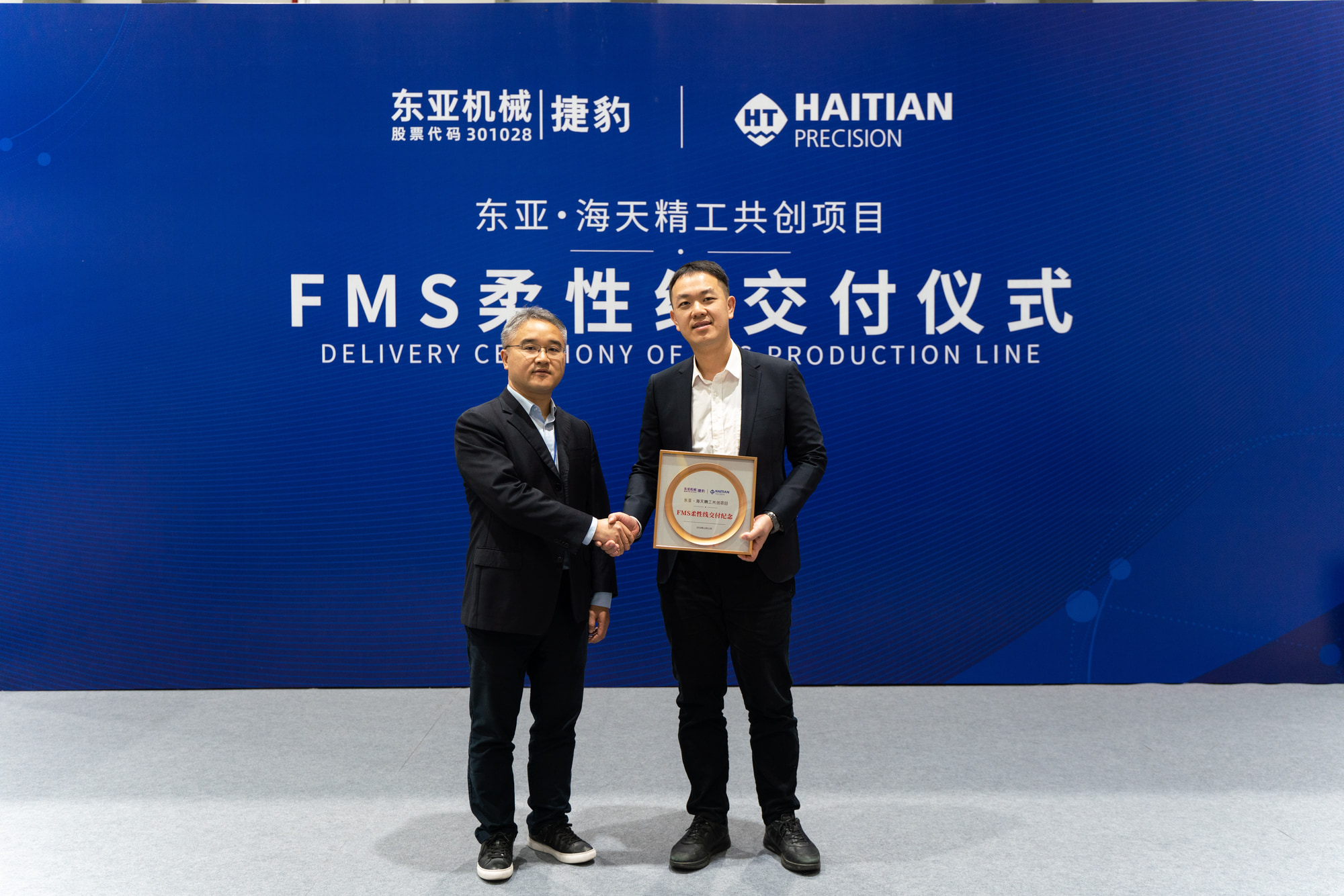 海天精工常務副總經理周益榮與東亞機械總經理韓文浩共同為FMS柔性線揭幕,兩大企業共創的成果正式亮相。之后,雙方互授了交付紀念牌,預示著將以此為契機,深化協同創新,實現更高層次的互利共贏。